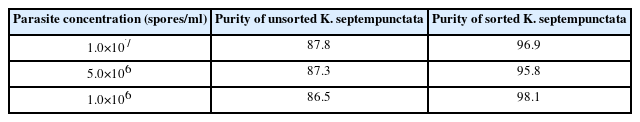 Table 2.Purity change of Kudoa septempunctata myxospores sorted by fluorescence activated cell sorting