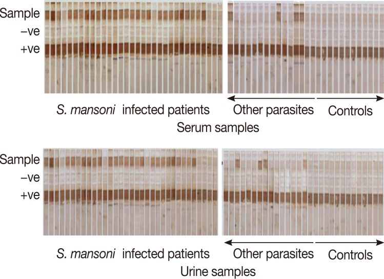 The dipstick assay was positive in urine samples in 52 out of 60 S. mansoni-infected patients giving 86.7% sensitivity, while in the serum, the dipstick assay was positive in 53 out of 60 Schistosoma-infected patients, and the sensitivity of the assay was 88.3% (Fig. 1). Patients who showed false negative results in urine and serum samples were among the light infection subgroup, and the mean number of eggs in their stool/g was 19.6±6.7 and 23.5±7.2, respectively. The specificity of the assay was determined as the sum of results of the negative control group and other parasite infected group. All the 30 negative controls were dipstick negative in both urine and serum samples while 6 patients out of 30 other parasite infected group showed positive dipstick in urine and 5 patients in serum; they were considered as false positives. The specificity of the assay in urine and serum, therefore, was determined as 90% and 91.7%, respectively. The diagnostic efficacy of the assay was 88.3% and 90.8%, respectively (Table 2).