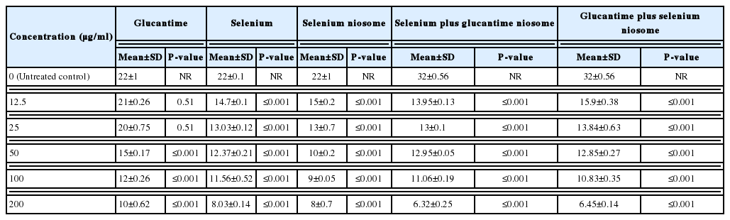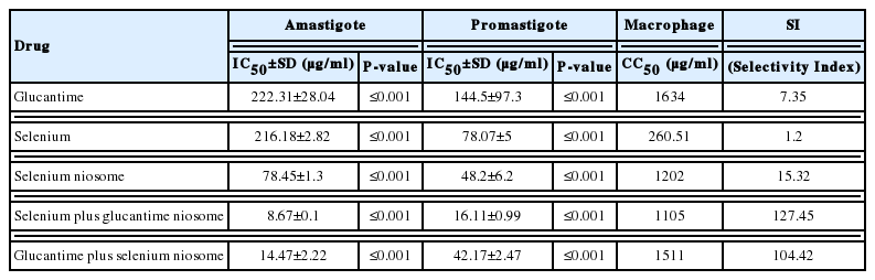 50 values of selenium plus glucantime niosome and glucantime plus selenium niosome were 16.11±0.99 and 42.17±2.47 μg/ml, respectively. All the drugs showed a good inhibition index against the growth rate of promastigotes, but selenium plus glucantime niosome formulation was the best (