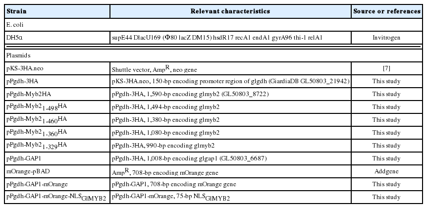 To examine and ascertain the putative NLS(s) required for the nuclear localization of GlMYB2, a series of plasmids, which expressed full-length GlMYB2 or truncated GlMYB2 losing of these putative NLS(s) in a hemagglutinin (HA)-tagged form, were constructed and transfected in Giardia trophozoites (Fig. 1B). A DNA fragment that contained the promoter for G. lamblia glutamate dehydrogenase (Glgdh) was constructed by PCR using primers, Pgdh-F and Pgdh-R (Supplement Table 1), and then cloned into pKS-3HA.neo [7] to obtain pPgdh-3HA. A full-length GlMYB2-encoding DNA fragment was amplified from Giardia genomic DNA using primers, Myb2-F and Myb2-R (Supplement Table 1), and cloned into plasmid pPgdh-3HA (Table 1). A PCR product, Myb21-498, was amplified using primers, Myb2-F and 498Myb2-R, and then used to express GlMYB2 without the third predicted NLS (#507-#530). The DNA fragments, Myb21-460 and Myb21-360, were prepared to obtain truncated GlMYB2 with the first and second NLSs and another truncated GlMYB2 with only the first NLS, respectively. Lastly, an additional expression plasmid was constructed to express truncated GlMYB2 without the NLSs (pPgdh-Myb21-329HA) in Giardia trophozoites.