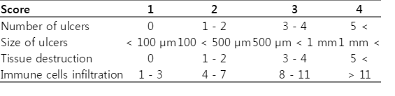 The colon tissue samples were isolated from mice, and washed with PBS. Then, the tissue samples were fixed with 4% paraformaldehyde, embedded in paraffin, mounted on glass slides, and stained with hematoxylin and eosin. For histological evaluation of the tissue damage, areas of inflammatory lesions were microscopically evaluated and scored, as shown in
