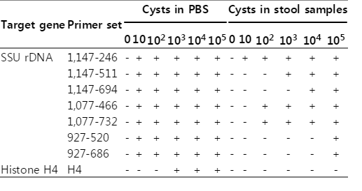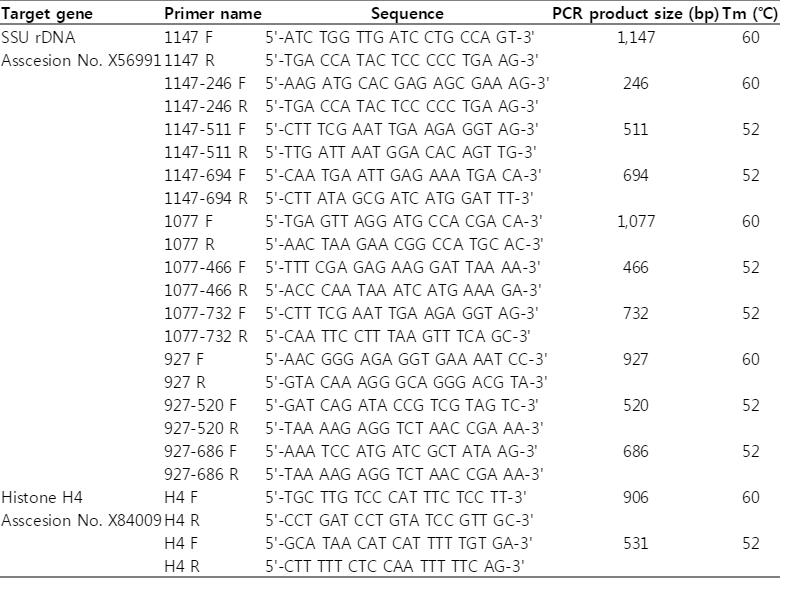 Target gene Primer name Sequence PCR product size (bp) Tm (℃) SSU rDNA 1147 F 5'-ATC TGG TTG ATC CTG CCA GT-3' 1,147 60 Asscesion No. X56991 1147 R 5'-TGA CCA TAC TCC CCC TGA AG-3' 1147-246 F 5'-AAG ATG CAC GAG AGC GAA AG-3' 246 60 1147-246 R 5'-TGA CCA TAC TCC CCC TGA AG-3' 1147-511 F 5'-CTT TCG AAT TGA AGA GGT AG-3' 511 52 1147-511 R 5'-TTG ATT AAT GGA CAC AGT TG-3' 1147-694 F 5'-CAA TGA ATT GAG AAA TGA CA-3' 694 52 1147-694 R 5'-CTT ATA GCG ATC ATG GAT TT-3' 1077 F 5'-TGA GTT AGG ATG CCA CGA CA-3' 1,077 60 1077 R 5'-AAC TAA GAA CGG CCA TGC AC-3' 1077-466 F 5'-TTT CGA GAG AAG GAT TAA AA-3' 466 52 1077-466 R 5'-ACC CAA TAA ATC ATG AAA GA-3' 1077-732 F 5'-CTT TCG AAT TGA AGA GGT AG-3' 732 52 1077-732 R 5'-CAA TTC CTT TAA GTT TCA GC-3' 927 F 5'-AAC GGG AGA GGT GAA AAT CC-3' 927 60 927 R 5'-GTA CAA AGG GCA GGG ACG TA-3' 927-520 F 5'-GAT CAG ATA CCG TCG TAG TC-3' 520 52 927-520 R 5'-TAA AAG AGG TCT AAC CGA AA-3' 927-686 F 5'-AAA TCC ATG ATC GCT ATA AG-3' 686 52 927-686 R 5'-TAA AAG AGG TCT AAC CGA AA-3' Histone H4 H4 F 5'-TGC TTG TCC CAT TTC TCC TT-3' 906 60 Asscesion No. X84009 H4 R 5'-CCT GAT CCT GTA TCC GTT GC-3' H4 F 5'-GCA TAA CAT CAT TTT TGT GA-3' 531 52 H4 R 5'-CTT TTT CTC CAA TTT TTC AG-3' Target gene Primer set Cysts in PBS