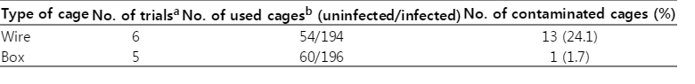 Type of cage No. of trialsa No. of used cagesb (uninfected/infected) No. of contaminated cages (%) Wire 6 54/194 13 (24.1) Box 5 60/196 1 (1.7)