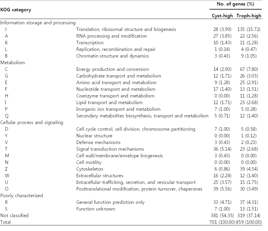 10] revealed higher percentages of cyst genes related to D, T, and O articles than those of trophozoites. Especially, KOG analysis of microarray showed a higher percentage of cyst genes to T and O articles, and a lower percentage of cyst genes related to J (translation, ribosomal structure, and biogenesis) and C (energy production and conversion) articles than those of trophozoites (