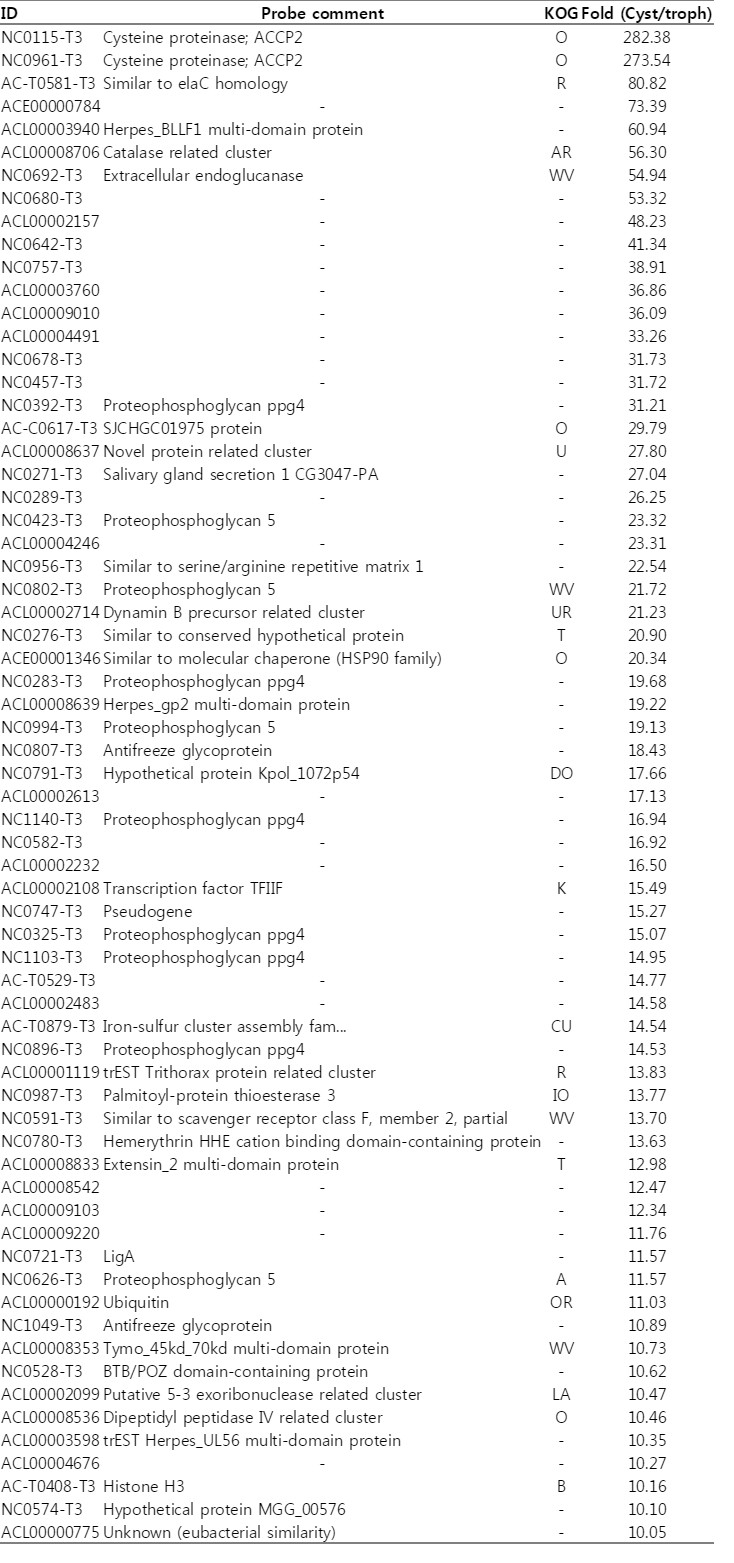 10]. These results commonly indicated that the exhibited high expression changes in cyst genes were significantly enriched for the signal transduction mechanisms (T article) and posttranslational modification, protein turnover, and chaperones (O article). This analysis reveals that signal transduction mechanism is essential for the formation of cysts, and various proteinases required for unnecessary protein degradation or posttranslational modifications. Cysteine proteinases that showed high expression changes in this study may be involved in protein degradation correlated with autophagic procession during encystation.
