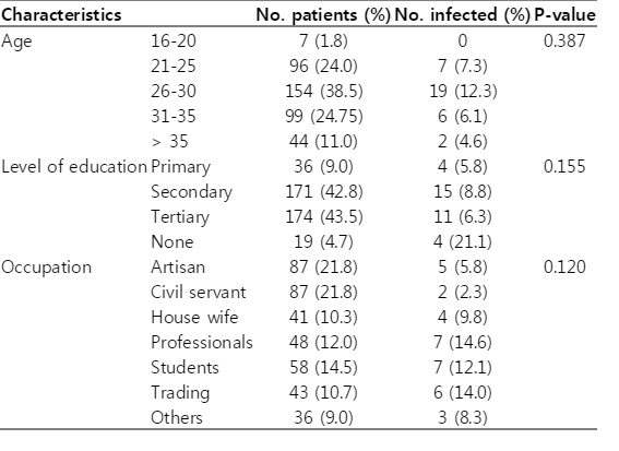 Table 2. Out of the 400 pregnant women involved in the study, their majority were in the age range of 26 to 30 years (38.5%). The overall prevalence of the infection in the study population was 8.5%. The majority of the pregnant women were educated to the secondary and tertiary level (42.8% and 43.5%, respectively). Most of the participants were artisans (21.8%) and civil servants (21.8%), but malaria was most prevalent among the professionals (14.6%) and traders (14.0%). The secondgravidae had the lowest prevalence of malaria (5.3%) while the multigravidae had the highest (9.8%) (