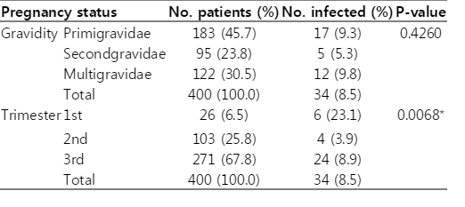 P=0.426). Most of the women were in their 3rd trimester (67.8%) with infection rate of 8.9%. The prevalence of malaria was the highest among the primigravidae (23.1%) (