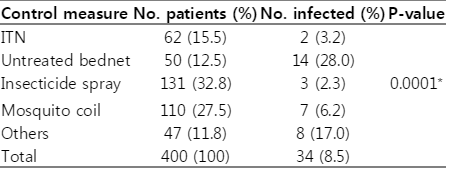 The most common malaria preventive measure was the use of insecticide spray (32.8%) , followed by the use of mosquito coil (27.5%). Only 15.5% depended on the use of ITN as the major mosquito control measure. The highest prevalence of infection was found among those who slept under an untreated net as the major control measure (28.0%). The infection rate was the lowest among those that used insecticide spray (2.3%), followed by those who employed the use of ITN (3.2%) to control mosquitoes (