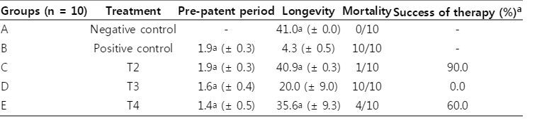 12], during 41 days of the experiment. This study evaluated the mean and SD of the prepatent period, longevity, mortality, and success of treatments in mice experimentally infected with