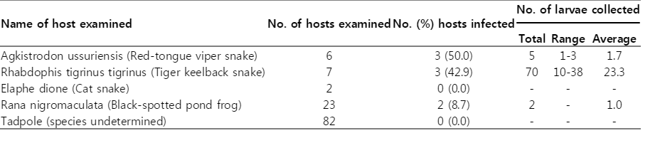 Table 1.The results of larval G. nipponicum recovery in amphibian and reptile hosts from Jeju-do (Province)