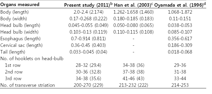- 7. Han ET, Lee JH, Choi SY, Park JH, Shin EH, Chai JY. Surface ultrastructure of the advanced third-stage larvae of Gnathostoma nipponicum. J Parasitol 2003;89:1245-1248.
