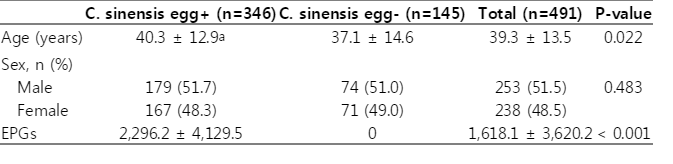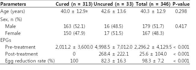 Table 3). Age and gender differences were not significant between the cured and uncured groups, but EPGs, 2,011.2±3,600.0 in cured and 4,998.5±7,012.0 in uncured, differed significantly (