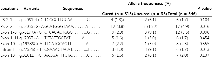 P=0.013). SNP variant of g.-20555G>A was 3.8% in cured group but 15.2% in uncured group, and that of g.27526C>T was 1.0% and 9.1%, respectively (