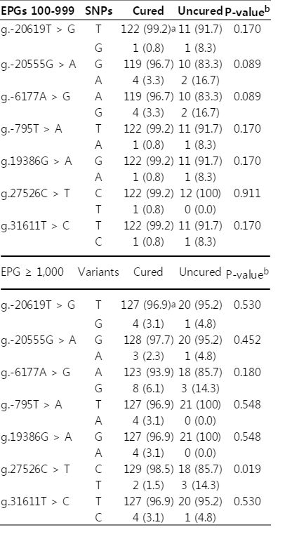 Cure rates were compared by the 7 allelic locations of SNP variation by EPGs. The SNP frequencies of all locations showed no significant differences of cure rates in the group of EPGs 100-999. However, g.27526C>T variants revealed a significantly low cure rate in the group of EPGs ≥1,000 (