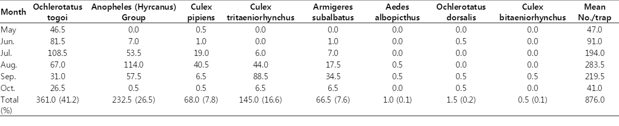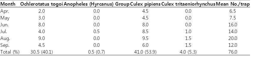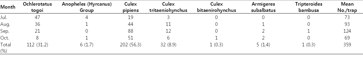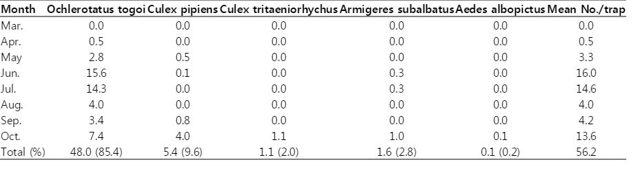 Oc. togoi peaked in August, then decreased markedly thereafter. There were a trap mean of 359.0 mosquitoes from 5 genera and 7 species collected from Sim-ri (