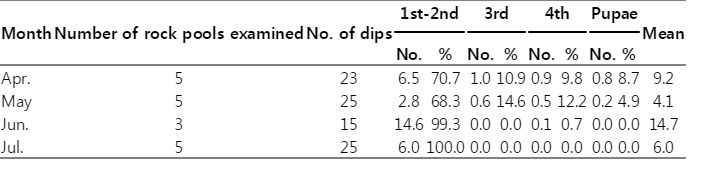 At Wimi-ri, the number of Oc. togoi (14.7) was the highest in April. Unlike the previous 2 sites, larvae were comprised mostly of 1st and 2nd instars (70.7%). The sampling schedule was disrupted at times due to frequent periods of drought, which resulted in some of the rock pools drying.