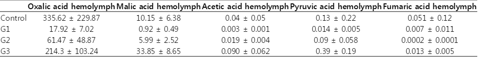 In hemolymph samples, a significant positive correlation was found between oxalic and fumaric acids. In tissue samples, a highly significant positive correlation was found between acetic and pyruvic acids. Other significant correlations were also detected between the followings: a significant positive correlation between the concentrations of oxalic acid in hemolymph and acetic acid in tissue (r=0.925), between the concentrations of fumaric acid in hemolymph and acetic acid in tissue (r=0.915), and between the concentrations of fumaric acid in hemolymph and pyruvic acid in tissue (r=0.874). A highly significant positive correlation was found between the concentrations of oxalic acid in hemolymph and pyruvic acid in tissue (r=0.94) (Table 5).