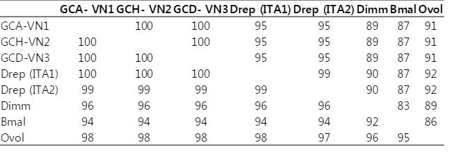 Table 3.Percentage identity of nucleotide (above diagonal) and amino acid homology (below diagonal) of cox1 sequences of Vietnamese Dirofilaria repens and other Filaridae in GenBank