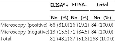 The degree of agreement between ELISA and the microscopy was determined by calculating kappa (κ) values with 95% confidence intervals, using the Epi-Info software. Kappa values express the agreement beyond change, and a 'κ' value of 0.21-0.60 represents a fair to moderate agreement, 0.60-0.80 represents a substantial agreement, and >0.80 represents almost perfect agreement [