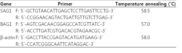 Gene Primer Temperature annealing (˚C) SAG1 F: 5´-GCTGTAACATTGAGCTCCTTGASTTCCTG-3´ 58.5 R: 5´-CCGGAACAGTACTGATTGTTGTCTTGAG-3´ BAG1 F: 5´-AGTCGACAACGGAGCCATCGTTATC-3´ 57.0 R: 5´-ACCTTGATCGTGACACGTAGAACGC-3´ β-actin F: 5´-GACCTTACCGAGTACATGATGAAG-3´ 58.0 R: 5´-CCATCGGGCAATTCATAGGAC-3´