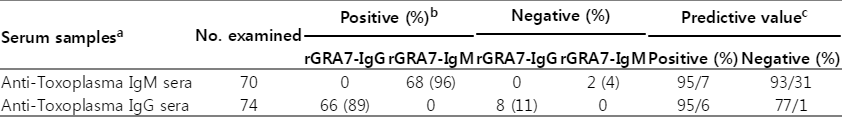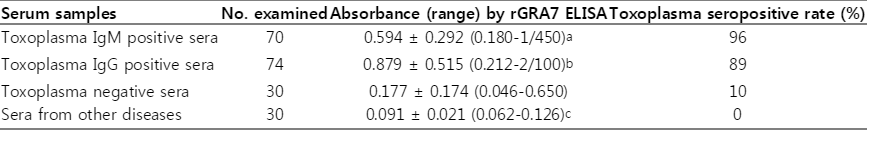 rGRA7-IgG rGRA7-IgM rGRA7-IgG rGRA7-IgM Positive (%) Negative (%) Anti-Toxoplasma IgM sera 70 0 68 (96) 0 2 (4) 95/7 93/31 Anti-Toxoplasma IgG sera 74 66 (89) 0 8 (11) 0 95/6 77/1 Serum samples No. examined Absorbance (range) by rGRA7 ELISA Toxoplasma seropositive rate (%) Toxoplasma IgM positive sera 70 0.594 ± 0.292 (0.180-1/450)a 96 Toxoplasma IgG positive sera 74 0.879 ± 0.515 (0.212-2/100)b 89 Toxoplasma negative sera 30 0.177 ± 0.174 (0.046-0.650) 10 Sera from other diseases 30 0.091 ± 0.021 (0.062-0.126)c 0
