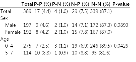 Table 4. There was no significant difference in the change of EPR during 2008-2009 by sex, but the change of positive-and-positive (P-P) was significantly higher in 5-7-year-old children and the change of negative-and- negative (N-N) was significantly lower in 5-7-year-old children than in 0-4-year-old children (