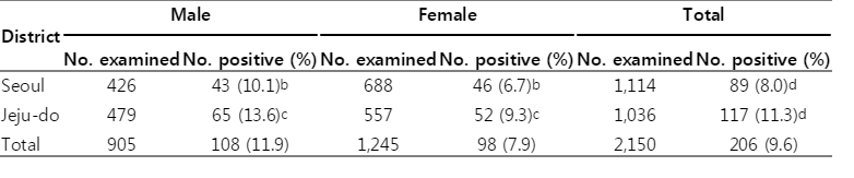 Table 1). The overall seroprevalence was a little higher in Jeju-do than in Seoul, although this difference was not statistically significant (
