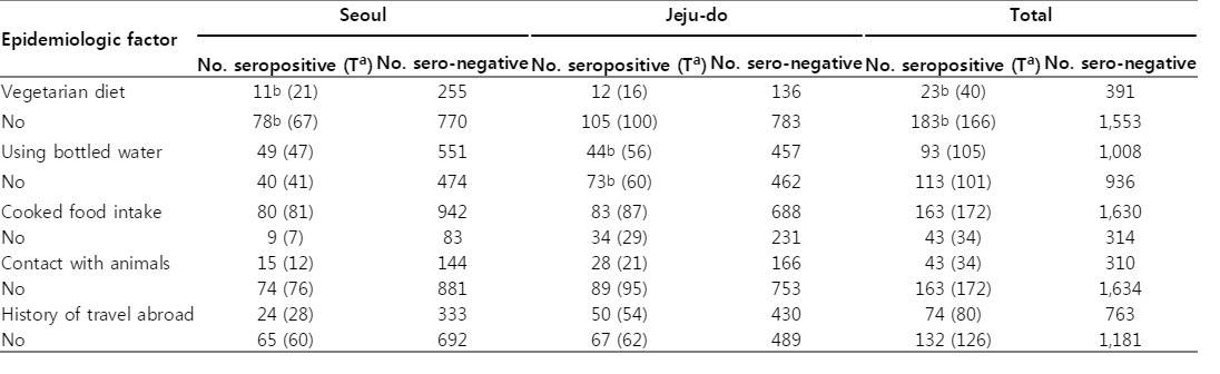 In the questionnaire, residents who preferred to eat a vegetarian diet and to drink bottled water were revealed to have a significantly lower (P<0.05) seroprevalence than those who ate meat and who consumed groundwater or well water. Those engaged in agriculture had a higher rate of seropositivity, whereas office workers and housewives tended to show lower seroprevalence, although there was no statistical significance (P<0.05) related with these occupation factors. It seems highly plausible that meat consumption is more closely related to infection with T. gondii than other possible factors in these 2 districts of Korea. Similarly, the higher seropositive rate in Jeju-do than in Seoul seems to be related to eating habits. It should be ruled out that the significantly lower seropositive rate among those who drank bottled water than those who consumed grounwater or well water might have been due to a lower risk of infection with T. gondii oocysts through bottled water.