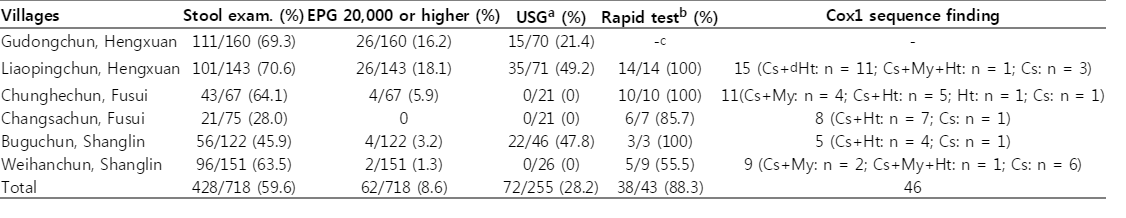 Table 1.The comparative results of ultrasonography, stool examination, immunoaffinity chromatography, and DNA sequencing for detection of liver and minute intestinal fluke (MIF) infections in Guangxi, China (2010)
