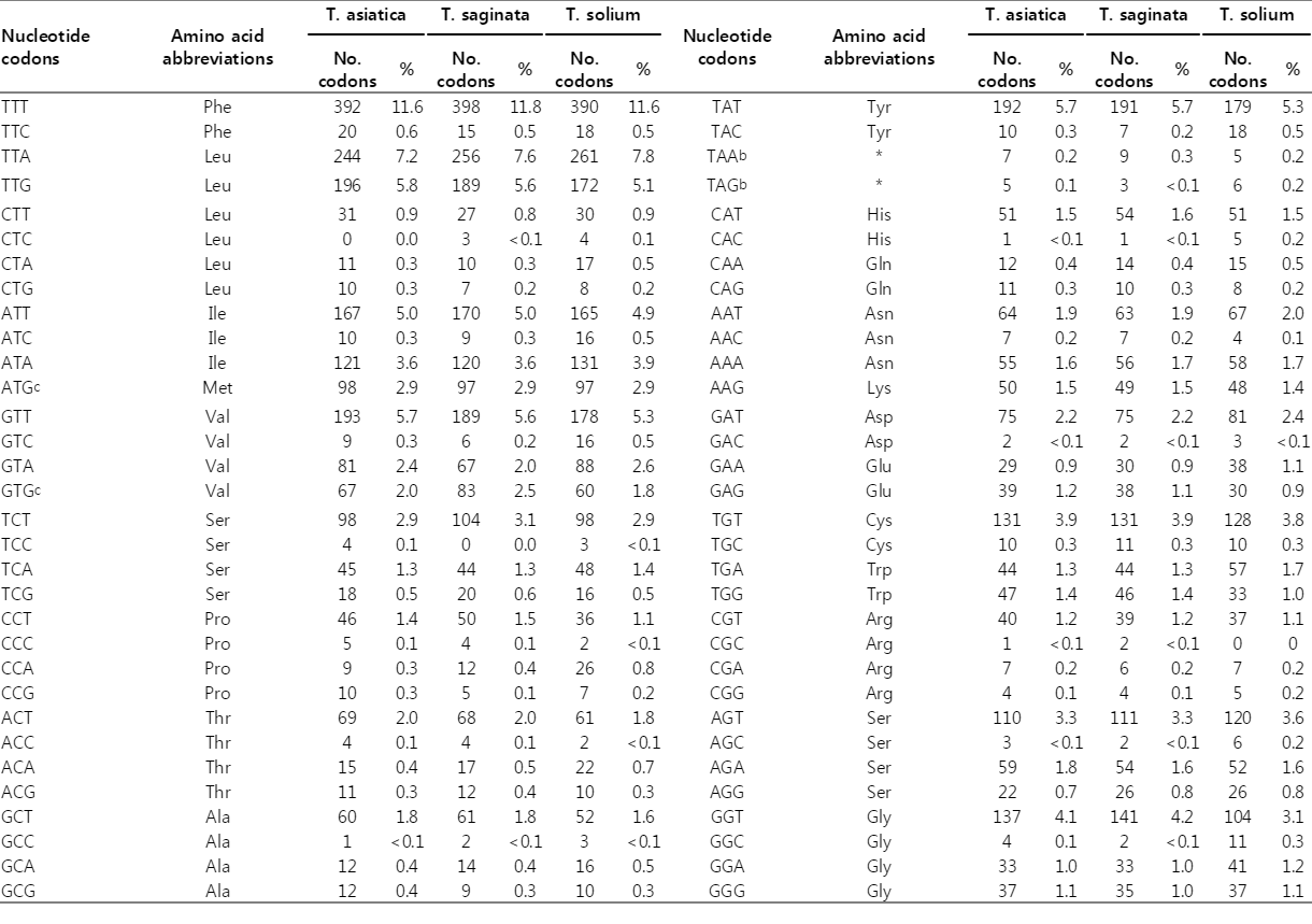 Taenia tapeworms was shown that phenylalanine (TTY), leucine (TTR, CTN), serine (AGN, TCN), and valine (GTN) constitute almost 50% of the total amino acid composition, while glutamine (CAR), lysine (AAG), histidine (CAY), and arginine (CGN) are the least abundant. This is due to the high T and low C content of the mtDNA, and the average frequent use of codons ending with T, A, G, and C (49%, 22.7%, 20.6%, and 7.6%, respectively) (
