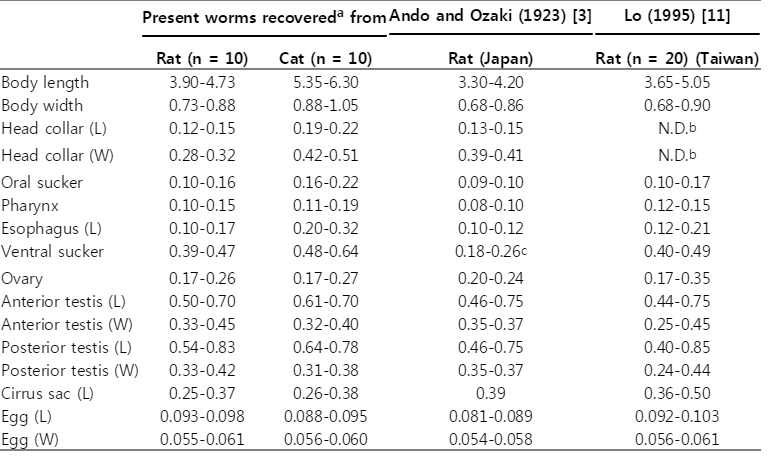 Table 1.Comparison of Echinostoma macrorchis adults recovered from experimental rats and a cat with those described by previous authors