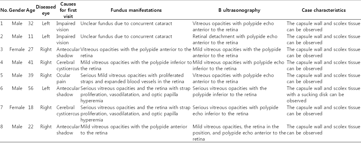 Between 2000 and 2011, 8 people were treated for intraocular cysticercosis at the Yunnan Red Cross Hospital, Yunnan Province, China. The patients comprised of 6 males and 2 females whose ages ranged from 11 to 56 years old. All patients suffered from the disease in 1 eye during a period of 1 month to 2 years. They are members of Chinese minorities and live near the boundary of China. Among these 8 patients, 7 had raw meat-eating habit, 3 experienced anteocular shadows, 2 experienced impaired vision, and 1 suffered from eye ache. The presence of cysticercus was not detected in 2 patients until intraocular examination was done for cerebral cysticercosis. Cysticerci worms were found in the vitreous chamber of 5 out of 8 patients, whereas 3 out of 8 possessed subretinal infection. The visual light perception of the patients was approximately 0.5.