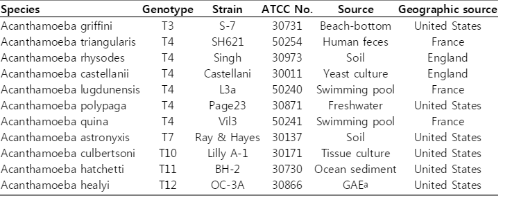 Table 1). Amoebae were cultured axenically in peptone-yeast-glucose (PYG) medium at 25℃, as previously described [
