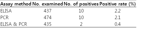 Assay method No. examined No. of positives Positive rate (%) ELISA 437 10 2.2 PCR 474 10 2.1 ELISA & PCR 435 2 0.4 Variables ELISA