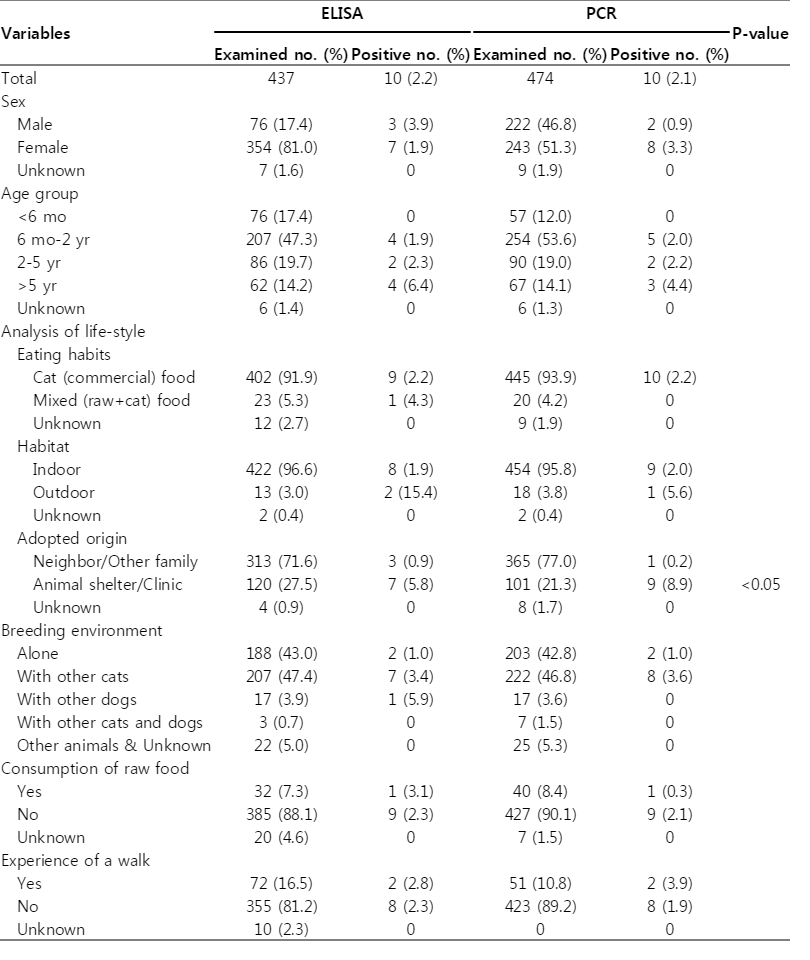 P-value Examined no. (%) Positive no. (%) Examined no. (%) Positive no. (%) Total 437 10 (2.2) 474 10 (2.1) Sex  Male 76 (17.4) 3 (3.9) 222 (46.8) 2 (0.9)  Female 354 (81.0) 7 (1.9) 243 (51.3) 8 (3.3)  Unknown 7 (1.6) 0 9 (1.9) 0 Age group  <6 mo 76 (17.4) 0 57 (12.0) 0  6 mo-2 yr 207 (47.3) 4 (1.9) 254 (53.6) 5 (2.0)  2-5 yr 86 (19.7) 2 (2.3) 90 (19.0) 2 (2.2)  >5 yr 62 (14.2) 4 (6.4) 67 (14.1) 3 (4.4)  Unknown 6 (1.4) 0 6 (1.3) 0 Analysis of life-style  Eating habits   Cat (commercial) food 402 (91.9) 9 (2.2) 445 (93.9) 10 (2.2)   Mixed (raw+cat) food 23 (5.3) 1 (4.3) 20 (4.2) 0   Unknown 12 (2.7) 0 9 (1.9) 0  Habitat   Indoor 422 (96.6) 8 (1.9) 454 (95.8) 9 (2.0)   Outdoor 13 (3.0) 2 (15.4) 18 (3.8) 1 (5.6)   Unknown 2 (0.4) 0 2 (0.4) 0  Adopted origin   Neighbor/Other family 313 (71.6) 3 (0.9) 365 (77.0) 1 (0.2)   Animal shelter/Clinic 120 (27.5) 7 (5.8) 101 (21.3) 9 (8.9) <0.05   Unknown 4 (0.9) 0 8 (1.7) 0 Breeding environment  Alone 188 (43.0) 2 (1.0) 203 (42.8) 2 (1.0)  With other cats 207 (47.4) 7 (3.4) 222 (46.8) 8 (3.6)  With other dogs 17 (3.9) 1 (5.9) 17 (3.6) 0  With other cats and dogs 3 (0.7) 0 7 (1.5) 0  Other animals & Unknown 22 (5.0) 0 25 (5.3) 0 Consumption of raw food  Yes 32 (7.3) 1 (3.1) 40 (8.4) 1 (0.3)  No 385 (88.1) 9 (2.3) 427 (90.1) 9 (2.1)  Unknown 20 (4.6) 0 7 (1.5) 0 Experience of a walk  Yes 72 (16.5) 2 (2.8) 51 (10.8) 2 (3.9)  No 355 (81.2) 8 (2.3) 423 (89.2) 8 (1.9)  Unknown 10 (2.3) 0 0 0