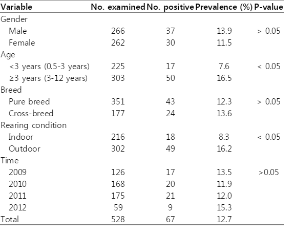 P>0.05). Compared with the younger dogs (17/225, 7.6%), a higher seroprevalence of infection (50/303, 16.5%) was detected in the ≥3 years old group, which was possibly due to their longer exposure to the mosquito bites [