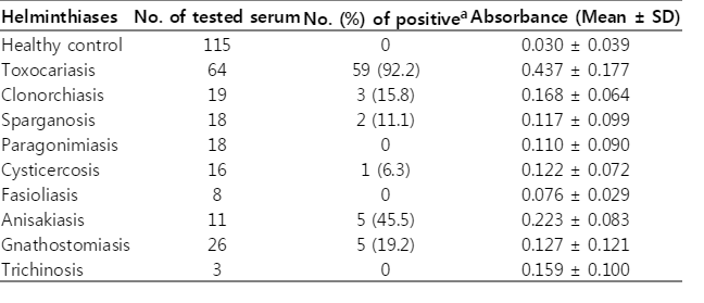 Table 1). The absorbances of 64 toxocariasis patients ranged from 0.010 to 0.750 (0.437±0.177). When the absorbance at 450 nm was blanked with the PBS, an absorbance of 0.250 was set as the optimum cut-off value to discriminate the positive and negative reactions (