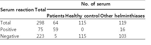 To evaluate the performance of different antigens for detection of toxocariasis in Korea, we analyzed the assay with different groups of serum samples. A total of 298 serum samples that received from respective hospitals of Korea used in this study. The serum samples were collected from different patients using conventional method by centrifuge 10 min at 3,000 rpm after clotting and stored at -20℃ in the Institute of Endemic Diseases, Seoul National University, Seoul, Korea until assay. Sixty-four serum samples were obtained from patients with toxocariasis which was confirmed by clinical, hematological, past history, and response to anthelminthic medication. Of the 64 toxocariasis patients, 56 were included in previous reports [