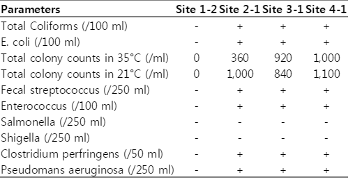 Table 1). We tested the first samples (sites 1-1, 2-1, 3-1, and 4-1) for 57 parameters of Korean Drinking Water Quality Standards (KDWQS) including total coliforms,