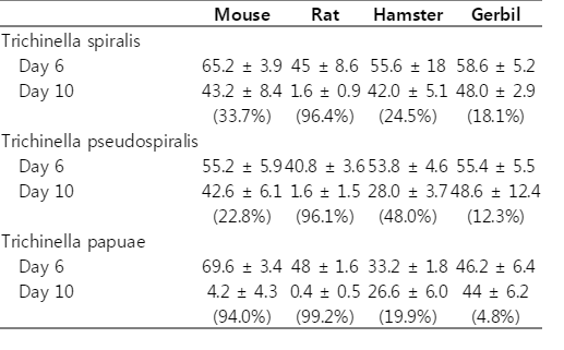 Mouse Rat Hamster Gerbil Trichinella spiralis  Day 6 65.2 ± 3.9 45 ± 8.6 55.6 ± 18 58.6 ± 5.2  Day 10 43.2 ± 8.4 1.6 ± 0.9 42.0 ± 5.1 48.0 ± 2.9 (33.7%) (96.4%) (24.5%) (18.1%) Trichinella pseudospiralis  Day 6 55.2 ± 5.9 40.8 ± 3.6 53.8 ± 4.6 55.4 ± 5.5  Day 10 42.6 ± 6.1 1.6 ± 1.5 28.0 ± 3.7 48.6 ± 12.4 (22.8%) (96.1%) (48.0%) (12.3%) Trichinella papuae  Day 6 69.6 ± 3.4 48 ± 1.6 33.2 ± 1.8 46.2 ± 6.4  Day 10 4.2 ± 4.3 0.4 ± 0.5 26.6 ± 6.0 44 ± 6.2 (94.0%) (99.2%) (19.9%) (4.8%) Mice Rats Hamsters Gerbils Trichinella spiralis 78.8 ± 20.7 (57-101) 63.6 ± 6.6 (56-73) 247.4 ± 97.2 (135-297) 528.6 ± 20.6 (504-556) Trichinella pseudospiralis 56.4 ± 3.3 (50-58) 10.3 ± 4.6 (5-14) 210.9 ± 51.4 (150-267) 432.6 ± 48 (380-489) Trichinella papuae 36.1 ± 11.7 (26-56) 9.8 ± 2.3 (6-11) 59.9 ± 3.8 (53-62) 241.5 ± 41.0 (187-291)