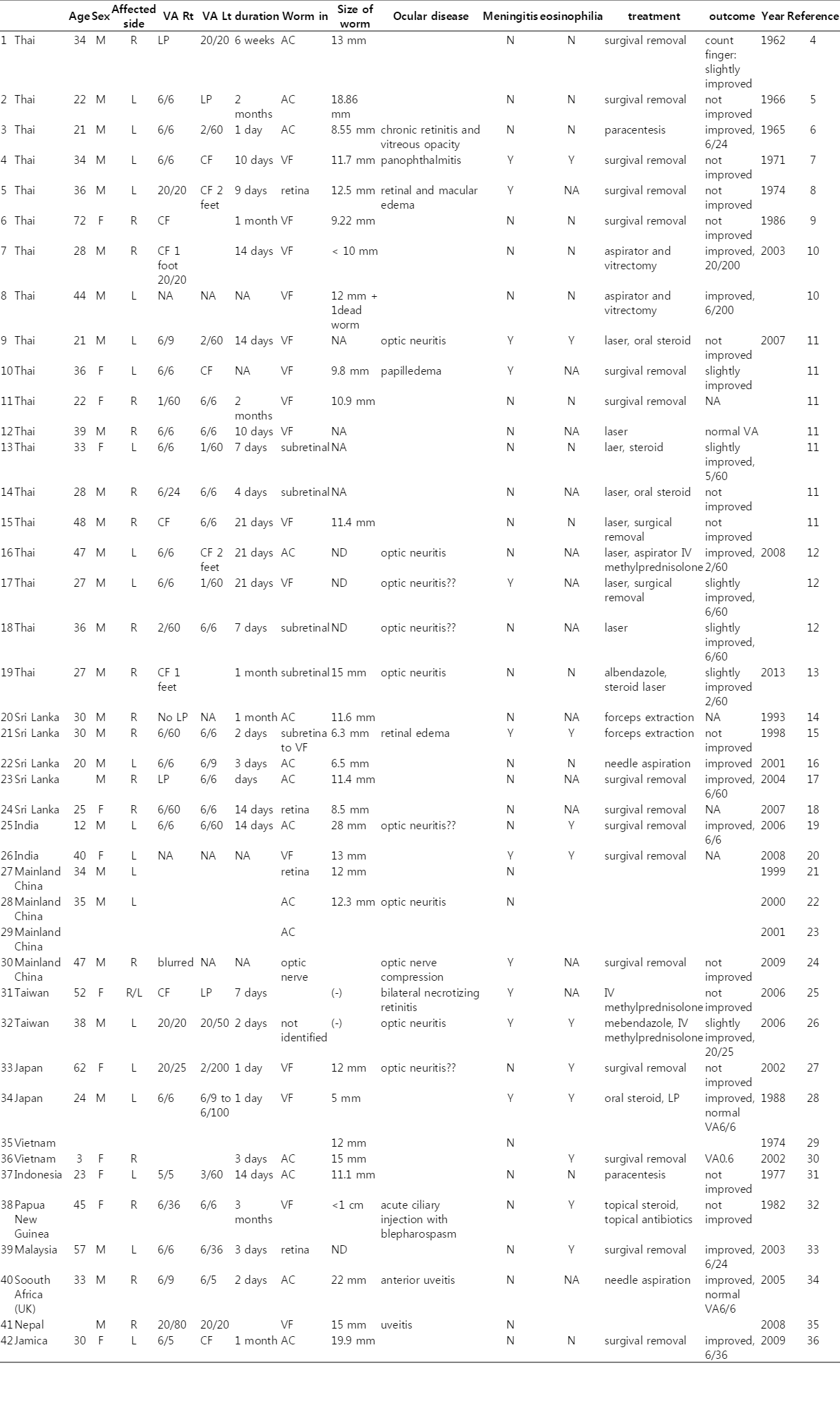 All 42 cases of ocular angiostrongyliasis are listed in