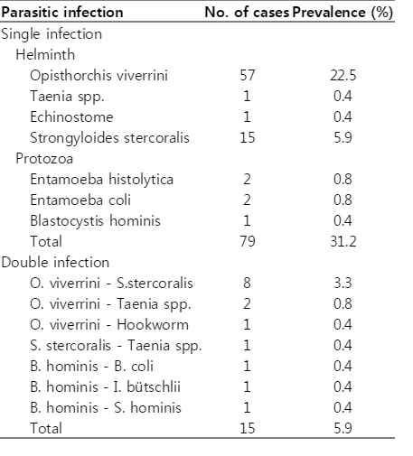 Of the 253 stool samples, 102 were collected from males (42%), 140 from females (58%), and 11 samples without marking the gender, aged 2-80 years with the mean age of 55.0±1.4 years. Most participants (99.2%) were buddhists and native northeastern people. Seventy percent of participants had completed only the primary school. The principal occupations in this community were agriculturist (35.5%), laborer (24.2%), and housewife (18.6%). Ninety-four individuals were infected with 1 or more parasites (