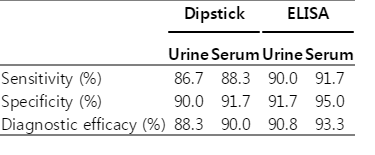 Table 2.Diagnostic indices (sensitivity, specificity, and diagnostic efficacy) of dipstick and ELISA in studied groups