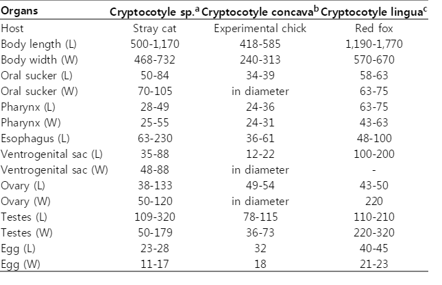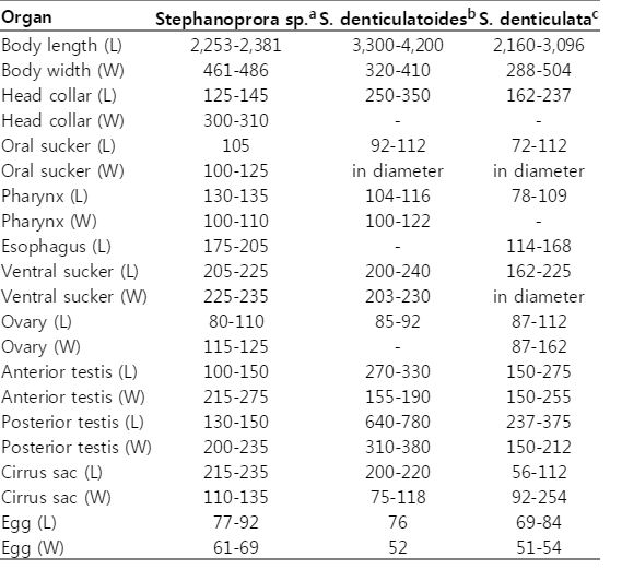 Organs Cryptocotyle sp.a Cryptocotyle concavab Cryptocotyle linguac Host Stray cat Experimental chick Red fox Body length (L) 500-1,170 418-585 1,190-1,770 Body width (W) 468-732 240-313 570-670 Oral sucker (L) 50-84 34-39 58-63 Oral sucker (W) 70-105 in diameter 63-75 Pharynx (L) 28-49 24-36 63-75 Pharynx (W) 25-55 24-31 43-63 Esophagus (L) 63-230 36-61 48-100 Ventrogenital sac (L) 35-88 12-22 100-200 Ventrogenital sac (W) 48-88 in diameter - Ovary (L) 38-133 49-54 43-50 Ovary (W) 50-120 in diameter 220 Testes (L) 109-320 78-115 110-210 Testes (W) 50-179 36-73 220-320 Egg (L) 23-28 32 40-45 Egg (W) 11-17 18 21-23 Organ Stephanoprora sp.a S. denticulatoidesb S. denticulatac Body length (L) 2,253-2,381 3,300-4,200 2,160-3,096 Body width (W) 461-486 320-410 288-504 Head collar (L) 125-145 250-350 162-237 Head collar (W) 300-310 - - Oral sucker (L) 105 92-112 72-112 Oral sucker (W) 100-125 in diameter in diameter Pharynx (L) 130-135 104-116 78-109 Pharynx (W) 100-110 100-122 - Esophagus (L) 175-205 - 114-168 Ventral sucker (L) 205-225 200-240 162-225 Ventral sucker (W) 225-235 203-230 in diameter Ovary (L) 80-110 85-92 87-112 Ovary (W) 115-125 - 87-162 Anterior testis (L) 100-150 270-330 150-275 Anterior testis (W) 215-275 155-190 150-255 Posterior testis (L) 130-150 640-780 237-375 Posterior testis (W) 200-235 310-380 150-212 Cirrus sac (L) 215-235 200-220 56-112 Cirrus sac (W) 110-135 75-118 92-254 Egg (L) 77-92 76 69-84 Egg (W) 61-69 52 51-54