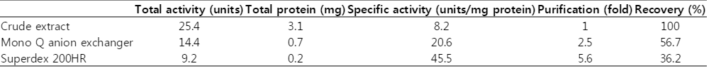 To purify CP of CRM, the crude extract was loaded onto Mono Q HR 5/5 column previously equilibrated with 20 mM sodium acetate buffer (pH 6.4) using ÄCTA FPLC system (Amersham Pharmacia Biotech, Piscataway, New Jersey, USA). The column was washed with the same buffer and absorbed proteins were gradually eluted with increasing the NaCl molarity up to 1 M. The column was eluted with a flow rate of 0.5ml/min, and each fraction was collected with 0.5 ml. The column fractions which had protease activity were pooled and loaded onto Superdex 200 HR 10/30 gel filtration column equilibrated with 20 mM sodium acetate buffer (pH 6.4) containing 0.1 M NaCl. The column was eluted with the same buffer by flow rate of 0.2 ml/min, and 0.5 ml fractions were collected. The fractions which showed highly proteolytic activity were analyzed by 7.5-15% gradient SDS-PAGE and then, used as a purified enzyme for further study. For estimation of molecular weight of partial purified CP, standard marker proteins were eluted with the same condition mentioned above and the relative molecular weight was calculated by manufacturer's instruction. Standard marker proteins used in this experiment were alcohol dehydrogenase (150 kDa), bovine serum albumin (66 kDa), carbonic anhydrogenase (29 kDa), and cytochrome c oxidase (12.4 kDa).
