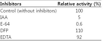 In inhibitors study, the activity of the purified protease was totally inhibited by cysteine protease inhibitors such as E-64 and IAA. However, serine or metalloprotease inhibitors including DFP and EDTA did not affect the activity of the enzyme (