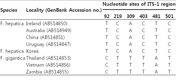 Table 1.Nucleotide comparison at 6 variable sites of ITS-1 region of Fasciola spp. from Korea and 7 other countries