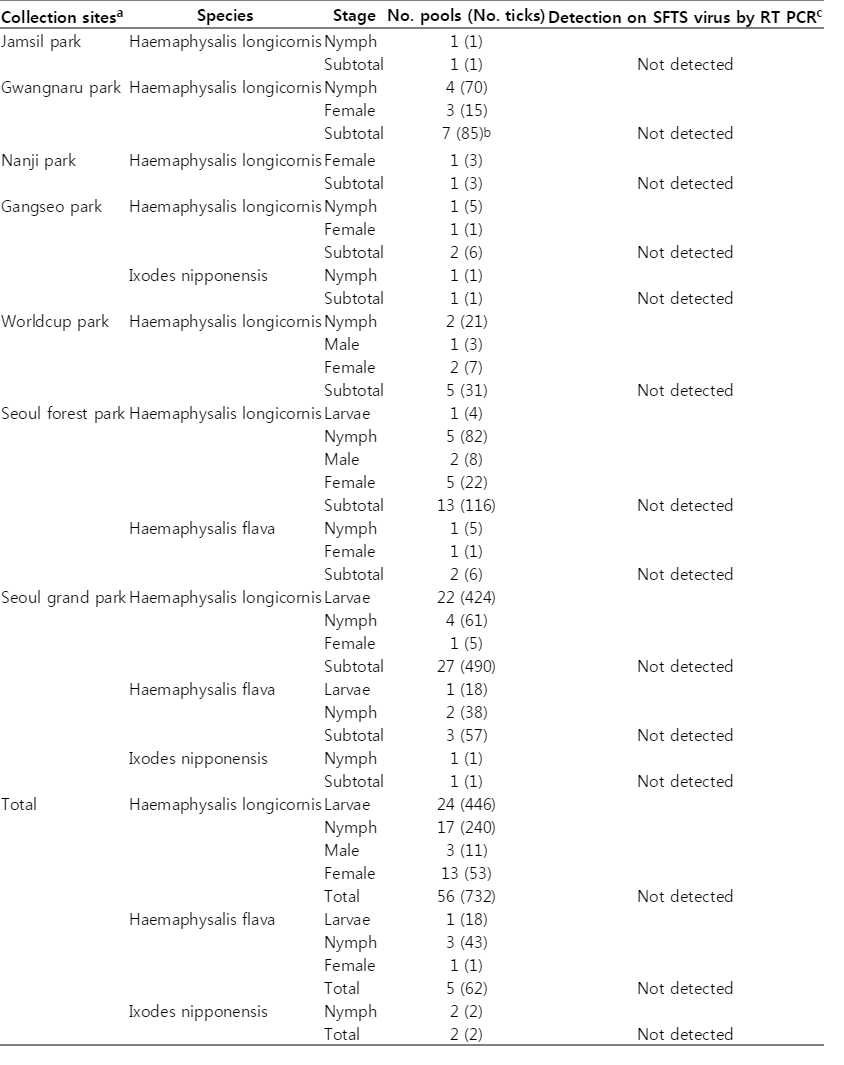 Table 1.Morphologic identification of ticks collected from natural/city parks from June to October 2013 and assayed for tick-borne severe fever with thrombocytopenia syndrome (SFTS) virus, by species and developmental stage