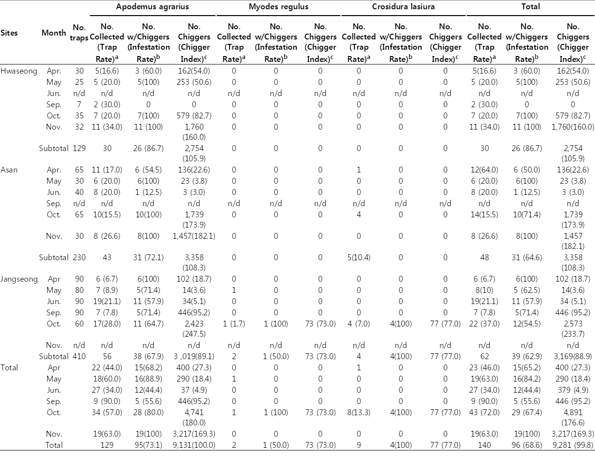 c) of larval chigger mites collected from small mammals at Hwaseong (Gyeonggi-do), Asan (Chungcheongnam-do) and Jangseong (Jeollanam-do) from April-November 2009, Korea