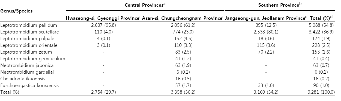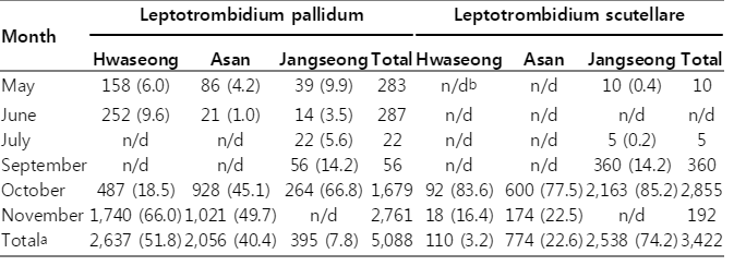 Table 3.Number (% of total/collection site) of larval chigger mites, by species, collected from small mammals captured at Hwaseong (Gyeonggi-do), Asan (Chungcheongnam-do) and Jangseong (Jeollanam-do) from April-November 2009, Korea